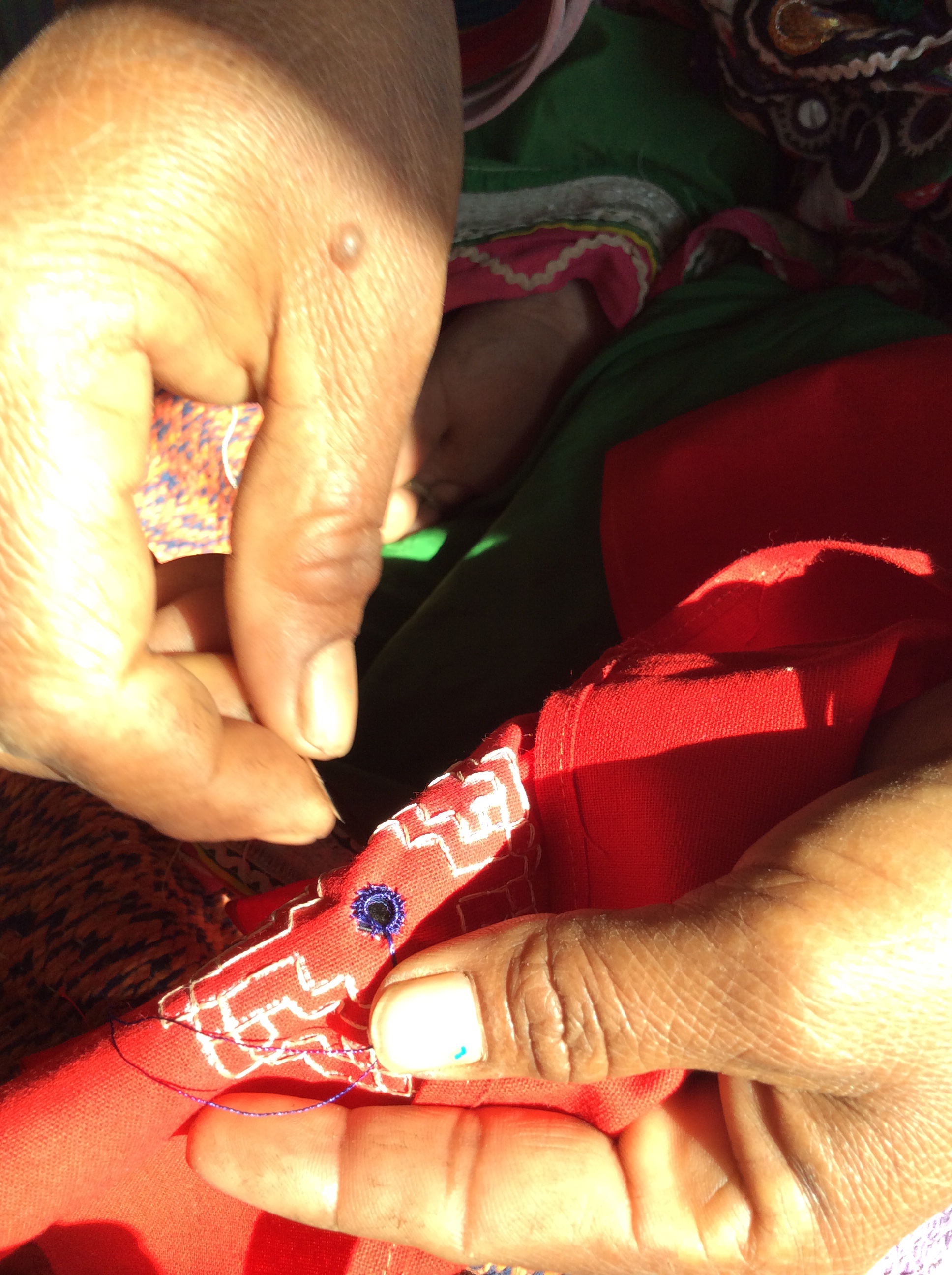 Quasab is a collective that sells for women in the Kutch area of Gujarat. They embroideries are different in each village group. Each one do unbelievably beautiful work. We visited their outlet today, learned all about their work be interested in and learned to do some embroidery from several village women who work at Quasab. Lunch at the hotel then off to the desert of Rann, almost to the Pakistan border. We had to go through a military checkpoint, show passports and pay 100 Rupees to go into the area. We stopped at a small village near the checkpoint looked at their wares and their B & B accomodations. The round mud houses are decorated with paint, the walls are plaster designs and amirrors.. I bought another quilt. Beautiful and a great bargain. My students will be interested. I plan to make a