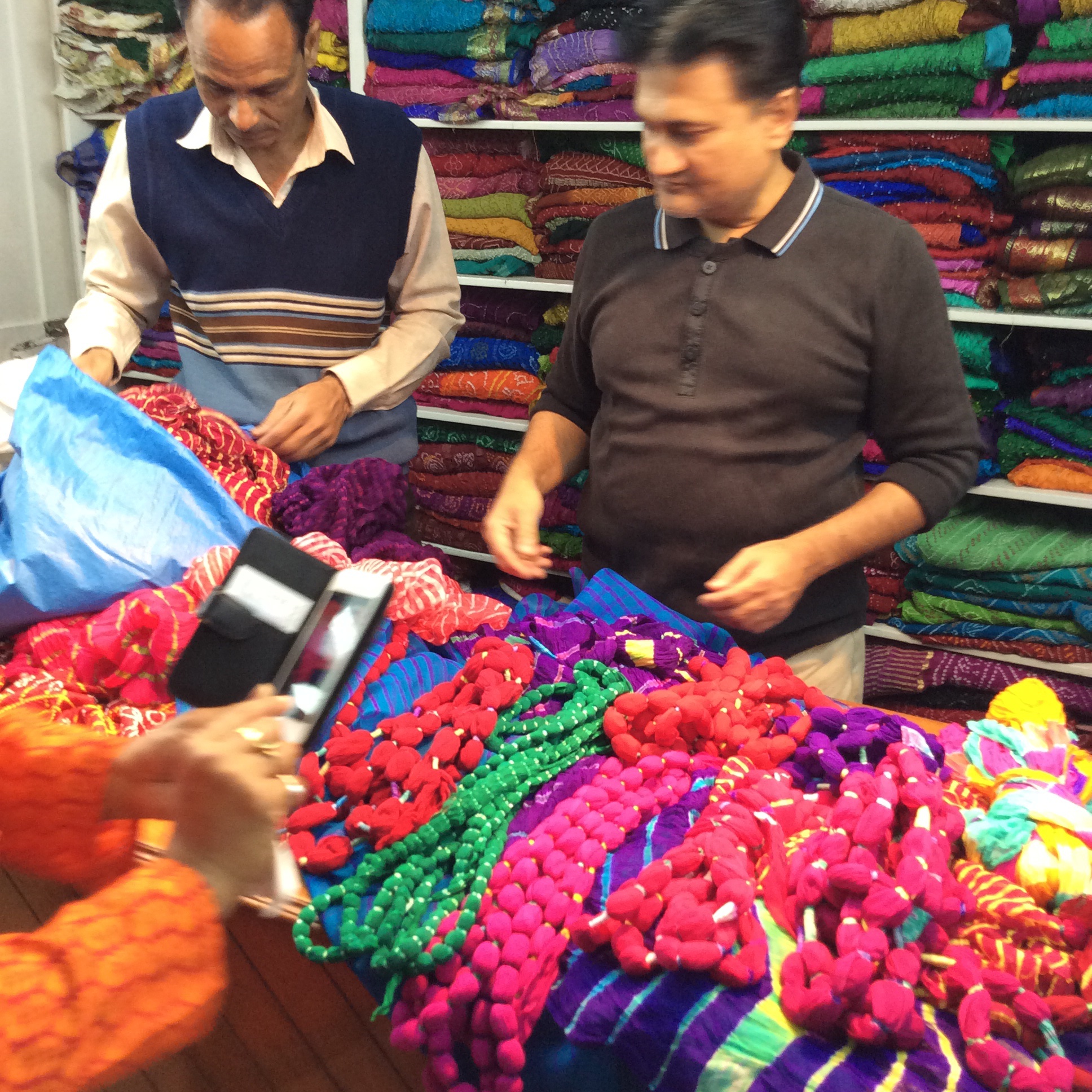 We headed to the old city in Ahmedabad to get fabric for the Appliqué workshop I will be teaching. Cars are not allowed the in old city so we tuk-tucked in. What a wild ride. Crowded with people, colorful, noisy with car horns, and the air filled with carbon monoxide. We got to our destination, a fabric store run by Muslim group. Beautiful fabrics. Of every color and pattern. On shelves, on the floor. I was in heaven. If you want a meter of fabric, the man sits on the floor, measures and tears. The prices run about $2.00 a meter and up. Pretty reasonable. I got what I needed On to the next store down the street. It was up a narrow metal staircase with a handrail and a rope to pull yourself up. We did some looking and price comparing. We will be returning. Stopped bought some more bandani scarves.